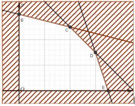Miền nghiệm là phần hình vẽ không tô màu ở hình trên, hay là ngũ giác \(OBCDE\) với \(O\left( {0;0} \right),\) \(B\left( {0;6} \right),\) \(C\left( {4;5} \right),\) \(D\left( {6;3} \right),\) \(E\left( {7;0} \right)\).