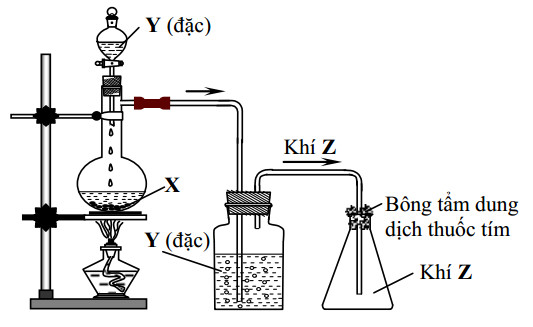 Trong phòng thí nghiệm, khí Z (làm mất màu dung dịch thuốc tím) được điều chế từ chất rắn X, dung dịch Y đặc, đun nóng và thu vào bình tam giác bằng phương pháp đẩy không khí như hình vẽ sau: