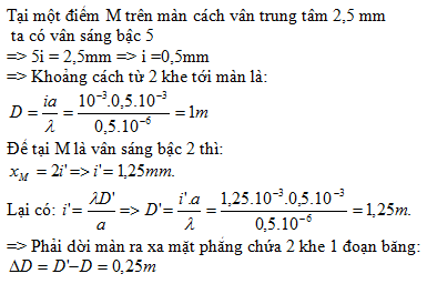 Trong thí nghiệm giao thoa ánh sáng với khe Young, bước sóng ánh sáng dùng trong thí nghiệm λ = 0,5 μm. Khoảng cách giữa hai khe a = 1 mm. Tại một điểm M trên màn cách vân trung tâm 2,5 mm ta có vân sáng bậc 5. Để tại đó là vân sáng bậc 2, phải dời màn dọc theo đường thẳng vuông góc với mặt phẳng chứa hai khe và màn theo chiều nào, một đoạn bằng bao nhiêu?