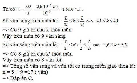 Trong thí nghiệm I-âng về giao thoa ánh sáng, hai khe được chiếu bằng ánh sáng đơn sắc có bước sóng 0,6 μm. Khoảng cách giữa hai khe là 1 mm, khoảng cách từ mặt phẳng chứa hai khe đến màn quan sát là 2,5 m, bề rộng miền giao thoa là 1,25 cm. Tổng số vân sáng và vân tối có trong miền giao thoa là