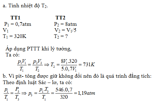 a. Sau khi bị nén thể tích của khí giảm đi 5 lần và áp suất tăng lên tới 8atm. Tính nhiệt độ của khí ở cuối quá trình nén?