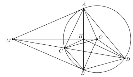 Mà \(M{{B}^{2}}=MC.MD\,\,\left( cmt \right)\Rightarrow MH.MO=MC.MD\Rightarrow \frac{MC}{MO}=\frac{MH}{MD}\)