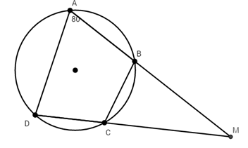 Tứ giác ABCD nội tiếp đường tròn có hai cạnh đối AB và CD cắt nhau tại M và \(\widehat{BAD}={{80}^{0}}\) thì \(\widehat{BCM}=?\)