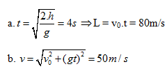 Từ một đỉnh tháp cao 80m, một vật nhỏ được ném theo phương ngang với v0 = 20m/s, g = 10m/s2.