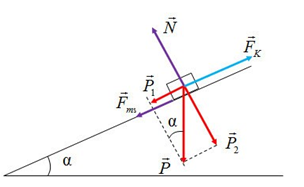 Lực ma sát : \({F_{ms}} = \mu .N = \mu .P\cos \alpha = \mu mg.\cos \alpha \,\,\,\,\left( 2 \right)\)