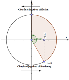 Từ VTLG, ta thấy thời điểm đầu tiên vật đi qua VTCB theo chiều âm, góc quét được là \(\dfrac{{5\pi }}{6}.\)