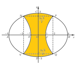Vườn hoa của một trường học có hình dạng được giới hạn bởi một đường elip có bốn đỉnh \(A,B,C,D \) và hai đường parabol có các đỉnh lần lượt là \(E,F \) (phần tô đậm của hình vẽ bên). Hai đường parabol có cùng trục đối xứng \(AB \), đối xứng với nhau qua trục \(CD \), hai parabol cắt elip tại các điểm \(M,N,P,Q \). Biết \(AB = 8m,CD = 6m,MN = PQ = 3 \sqrt 3 m,EF = 2m \). Chi phí để trồng hoa trên vườn là \(300.000 \) đ/m2 . Hỏi số tiền trồng hoa cho cả vườn gần nhất với số tiền nào dưới đây?