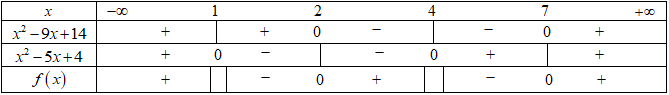 Đặt \(f\left( x \right) = \frac{{{x^2} - 9x + 14}}{{{x^2} - 5x + 4}}\) . Ta có bảng: