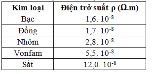 Xem bảng điện trở suất ở 20oC của một số kim loại.