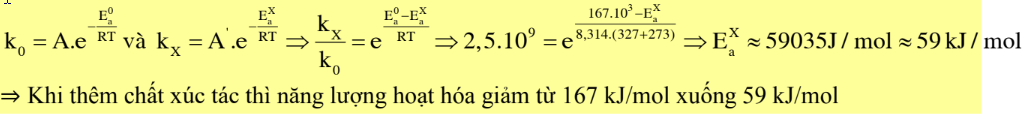 Biết năng lượng hoạt hoá của phản ứng bằng 167 kJ/mol. Khi có mặt chất xúc tác tốc độ phản ứng tăng 2,5.109 lần. Năng lượng hoạt hoá của phản ứng khi có mặt chất xúc tác là