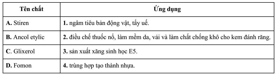 [Ghép mỗi mẫu tự A, B, C, D (là tên của hợp chất hữu cơ) với một trong - Tự Học 365] Ghép mỗi mẫu tự A, B, C, D (là tên của hợp chất hữu cơ) với một trong các số 1, 2, 3, 4 (là ứng dụng của hợp chất hữu cơ) sao cho thích hợp: