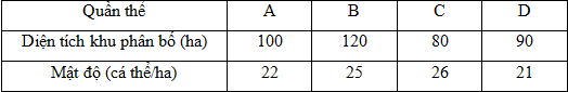 [Giả sử 4 quần thể của một loài thú kí hiệu là A B C D có diện tích khu phân bố và mật độ cá thể như - Tự Học 365] Giả sử 4 quần thể của một loài thú kí hiệu là A, B, C, D có diện tích khu phân bố và mật độ cá thể như sau: