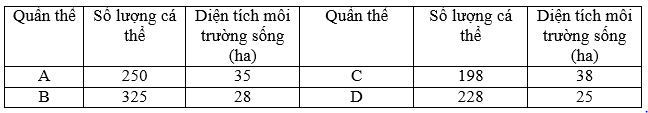 [Có 4 quần thể của cùng một loài được kí hiệu là A, B, C, D v - Tự Học 365] Có 4 quần thể của cùng một loài được kí hiệu là A, B, C, D với số lượng cá thể và diện tích môi trường sống tương ứng như sau: