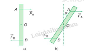 Một chiếc thước mảnh có trục quay nằm ngang đi qua trọng tâm O của thước. Dùng hai ngón tay tác dụng vào thước một ngẫu lực đặt vào hai điểm A và B cách nhau 4,5 cm và có độ lớn FA = FB = 1N (Hình vẽ a). Thanh quay đi một góc α = 30o. Hai lực luôn luôn nằm ngang và vẫn đặt tại A và B (Hình b). Tính momen của ngẫu lực?