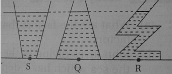 [Trọng lượng riêng của các chất lỏng tăng dần theo thứ tự bìn - Tự Học 365] Trọng lượng riêng của các chất lỏng tăng dần theo thứ tự bình Q, bình R, bình S. Sự so sánh áp suất ở đáy các bình theo cách nào dưới đây là đúng?