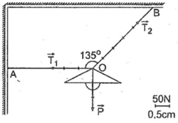 [Biểu diễn các vectơ lực tác dụng lên vật được treo bởi hai sợi dây giố - Tự Học 365] Biểu diễn các vectơ lực tác dụng lên vật được treo bởi hai sợi dây giống hệt nhau, có phương hợp với nhau một góc 120° (H.4.8). Biết sức căng của các sợi dây là bằng nhau và bằng trọng lượng của vật là 20N. Chọn tỉ xích 1cm = 10N