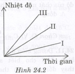 Hình 24.2 vẽ các đường biểu diễn sự thay đổi nhiệt độ theo thời gian của cùng một khối lượng nước, đồng, sắt được đun trên những bếp tỏa nhiệt như nhau. Hỏi đường biểu diễn nào tương ứng với nước, với đồng, với sắt?