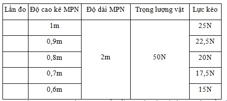 Gợi ý: Có thể sử dụng ngay từng bảng số liệu ở trên. trong đó có bổ sung thêm cột độ nghiêng của mặt phẳng nghiêng.