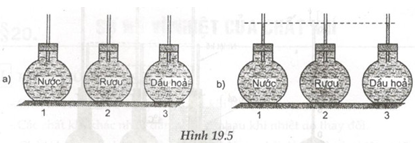 [Ba bình cầu 1, 2, 3 (H.19.5a) có cùng dung tích, nút có cắm các ống th - Tự Học 365] Ba bình cầu 1, 2, 3 (H.19.5a) có cùng dung tích, nút có cắm các ống thủy tinh đường kính trong bằng nhau. Bình 1 đựng đầy nước, bình 2 đựng đầy rượu, bình 3 đựng đầy dầu hỏa. Tăng nhiệt độ của ba bình cho tới khi mực chất lỏng trong ba ống thủy tinh dâng lên bằng nhau (H.19.5b). Khi đó