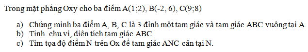 b) Cho DABC có trọng tâm G. Gọi M, N là các điểm xác định bởi \(\overrightarrow {AM} = 2\overrightarrow {AB} \), \(\overrightarrow {AN} = \dfrac{2}{5}\overrightarrow {AC} \). Chứng minh rằng: M, N, G thẳng hàng.
