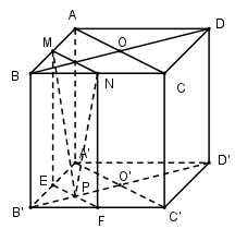 Cho hình lập phương $ABCD.A'B'C'D',AC$ và $BD$ cắt nhau tại $O,A'C'$ và $B'D'$ cắt nhau tại $O'$ . Các điểm $M,N,P$ theo thứ tự là trung điểm của $AB,BC,O'B'$. Khi đó thiết diện do mặt phẳng $\left( {MNP} \right)$ cắt hình lập phương sẽ là đa giác có số cạnh là bao nhiêu?