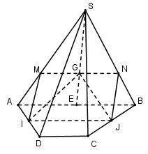 \(\left\{ \begin{array}{l}G \in \left( {SAB} \right) \cap \left( {{\rm{IJ}}G} \right)\\AB \subset \left( {SAB} \right)\\{\rm{IJ}} \subset \left( {{\rm{IJ}}G} \right)\\AB//{\rm{IJ}}\end{array} \right. \Rightarrow \) Trong $\left( {SAB} \right)$ qua $G$ kẻ \(MN//AB\left( {M \in SA;N \in SB} \right)\)