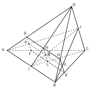Tương tự \(\left\{ \begin{array}{l}N \in \left( \alpha \right) \cap \left( {ABD} \right)\\AB\parallel \left( \alpha \right)\\AB \subset \left( {ABD} \right)\end{array} \right.\) suy ra giao tuyến của \(\left( \alpha \right)\)và $\left( {ABD} \right)$ là đường thẳng qua $N$ song song với $AB$ cắt $BD$ tại $H$ và cắt $AD$ tại $G$ .