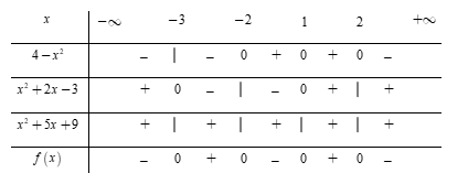 Dựa vào bảng xét dấu ta thấy \(\left( {4 - {x^2}} \right)\left( {{x^2} + 2x - 3} \right)\left( {{x^2} + 5x + 9} \right) < 0\) \( \Leftrightarrow \left[ \begin{array}{l}x < - 3\\ - 2 < x < 1\\x > 2\end{array} \right.\)