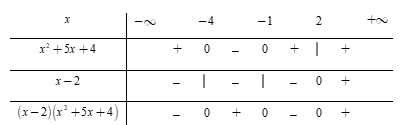 Dựa vào bảng xét dấu, ta thấy rằng $\left( {x - 2} \right)\left( {{x^2} + 5x + 4} \right) \ge 0 \Leftrightarrow x \in \left[ { - \,4; - \,1} \right] \cup \left[ {2; + \,\infty } \right).$