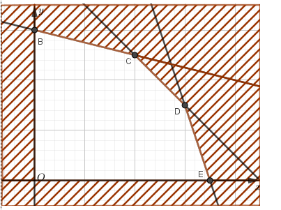 Miền nghiệm là phần hình vẽ không tô màu ở hình trên, hay là ngũ giác \(OBCDE\) với \(O\left( {0;0} \right),B\left( {0;6} \right),C\left( {4;5} \right),D\left( {6;3} \right),E\left( {7;0} \right)\).