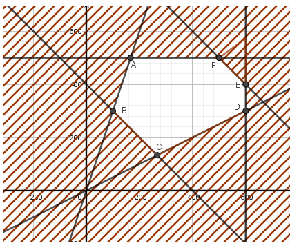 \(\begin{array}{l}A\left( {\dfrac{{500}}{3};500} \right),B\left( {100;300} \right),C\left( {\dfrac{{800}}{3};\dfrac{{400}}{3}} \right)\\D\left( {600;300} \right),E\left( {600;400} \right),F\left( {500;500} \right)\end{array}\)