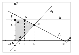 Trong mặt phẳng tọa độ \(Oxy,\) vẽ các đường thẳng \({d_1}:x - y - 1 = 0,\)\({d_2}:x + 2y - 10 = 0,\) \(\Delta :y = 4\)