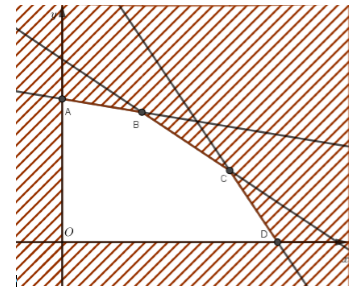 Miền nghiệm của hệ là ngũ giác \(OABCD\), ở đó \(O\left( {0;0} \right)\), \(A\left( {0;6} \right)\), \(B\left( {\dfrac{{10}}{3};\dfrac{{49}}{9}} \right)\), \(C\left( {7;3} \right)\), \(D\left( {9;0} \right)\).