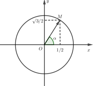 Gọi \(\varphi \) là 1 acgumen của số phức \(z\) có điểm biểu diễn là \(M\left( {\dfrac{1}{2};\dfrac{{\sqrt 3 }}{2}} \right)\) nằm trên đường tròn đơn vị, số đo nào sau đây có thể là một acgumen của \(z\)?