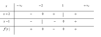 Dựa vào bảng xét dấu, ta thấy rằng $f\left( x \right) > 0$$ \Leftrightarrow x \in \left( { - \,\infty ; - \,2} \right) \cup \left( {1; + \,\infty } \right).$