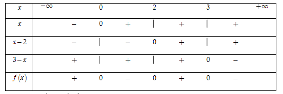 Ta có $x = 0;\,\,x - 2 = 0 \Leftrightarrow x = 2$ và $3 - x = 0 \Leftrightarrow x = 3.$Bảng xét dấu