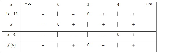 Ta có \(f\left( x \right) = \dfrac{{4x - 12}}{{{x^2} - 4x}} = \dfrac{{4x - 12}}{{x\left( {x - 4} \right)}}.\)