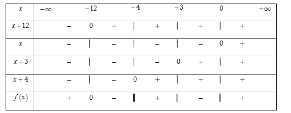 Ta có $f\left( x \right) = \dfrac{1}{x} + \dfrac{2}{{x + 4}} - \dfrac{3}{{x + 3}} < 0 \Leftrightarrow \dfrac{{x + 12}}{{x\left( {x + 3} \right)\left( {x + 4} \right)}} < 0.$