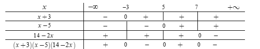 Từ bảng xét dấu ta thấy, tập nghiệm của bất phương trình $\left( {x + 3} \right)\left( {x - 5} \right)\left( {14 - 2x} \right) \le 0$ là \(S = \left[ { - 3;5} \right] \cup \left[ {7; + \infty } \right)\) (loại).