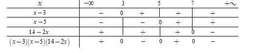 Từ bảng xét dấu ta thấy tập nghiệm $S = \left( { - \infty ;3} \right) \cup \left( {5;7} \right)$ là tập nghiệm của bất phương trình $\left( {x - 3} \right)\left( {x - 5} \right)\left( {14 - 2x} \right) > 0.$