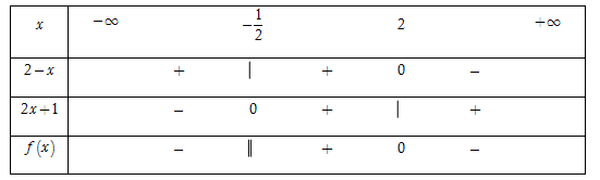 Đặt $f\left( x \right) = \dfrac{{2 - x}}{{2x + 1}}.$ Ta có $2 - x = 0 \Leftrightarrow x = 2$ và $2x + 1 = 0 \Leftrightarrow x = - \dfrac{1}{2}.$