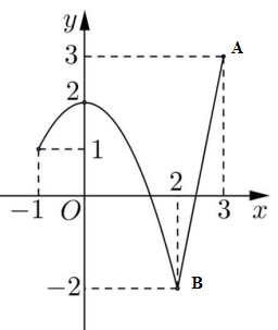 Từ đồ thị hàm số ta thấy trên đoạn \(\left[ { - 1;3} \right]\) thì điểm cao nhất của đồ thị là điểm \(A\left( {3;3} \right)\) và điểm thấp nhất của đồ thị là \(B\left( {2; - 2} \right)\) nên GTLN của hàm số là \(M = 3\) và GTNN của hàm số là \(m = - 2.\)