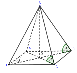 Do đó \(\alpha = \left( {SB,\left( {ABCD} \right)} \right) = \left( {SB,OB} \right) = \widehat {SBO}\) và \(\beta = \left( {SC,\left( {ABCD} \right)} \right) = \left( {SC,OC} \right) = \widehat {SCO}\).