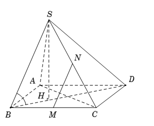 Do \(SH \bot \left( {ABCD} \right)\) nên \(\widehat {MN,\left( {ABCD} \right)} = \widehat {SB,\left( {ABCD} \right)} = \widehat {SB,HB} = \widehat {SBH}\).