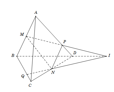 Cho tứ diện \(ABCD.\) Gọi \(M,{\rm{ }}N\) lần lượt là trung điểm của \(AB\) và \(CD.\) Mặt phẳng \(\left( \alpha \right)\) qua \(MN\) cắt \(AD,{\rm{ }}BC\) lần lượt tại \(P\) và \(Q.\) Biết \(MP\) cắt \(NQ\) tại \(I.\) Ba điểm nào sau đây thẳng hàng?