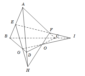 Cho tứ diện \(ABCD\). Gọi \(E,{\rm{ }}F,{\rm{ }}G\) là các điểm lần lượt thuộc các cạnh \(AB,{\rm{ }}AC,{\rm{ }}BD\) sao cho $EF$ cắt \(BC\) tại \(I\), \(EG\) cắt \(AD\) tại \(H\). Ba đường thẳng nào sau đây đồng quy?