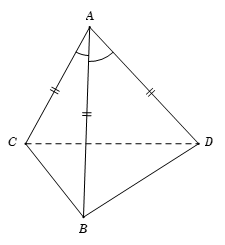 Cho tứ diện \(ABCD\) có \(AB = AC = AD\) và \(\widehat {BAC} = \widehat {BAD} = 60^\circ \). Hãy xác định góc giữa cặp vectơ \(\overrightarrow {AB} \) và \(\overrightarrow {CD} \)?
