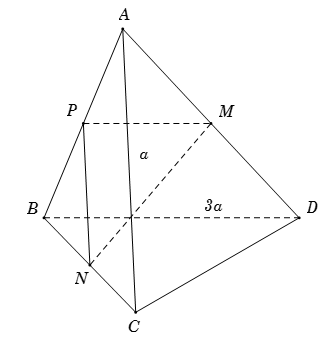Gọi \(P\) là trung điểm của \(AB\) \( \Rightarrow PN,PM\) lần lượt là đường trung bình của tam giác \(\Delta ABC\) và \(\Delta ABD\). Suy ra \(\left\{ \begin{array}{l}PN = \dfrac{1}{2}AC = \dfrac{a}{2}\\PM = \dfrac{1}{2}BD = \dfrac{{3a}}{2}\end{array} \right..\)