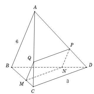Cho tứ diện $ABCD$ trong đó $AB = 6{,^{}}CD = 3$, góc giữa $AB$ và $CD$ là $60^\circ $ và điểm $M$ trên $BC$ sao cho $BM = 2MC$. Mặt phẳng $\left( P \right)$ qua $M$ song song với $AB$ và $CD$ cắt $BD{,^{}}AD{,^{}}AC$ lần lượt tại $N,P,Q$. Diện tích $MNPQ$ bằng:
