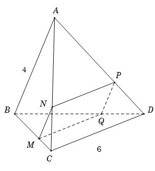 Cho tứ diện $ABCD$ có $AB$ vuông góc với $CD$, $AB = 4{,^{}}CD = 6$. $M$ là điểm thuộc cạnh $BC$ sao cho $MC = 2BM$. Mặt phẳng $\left( P \right)$ đi qua $M$ song song với $AB$ và $CD$. Diện tích thiết diện của $\left( P \right)$ với tứ diện là: